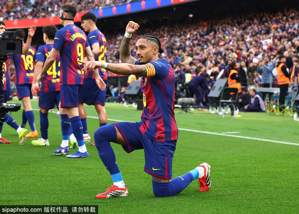 下半场开始,第52分钟,拉菲尼亚上演帽子戏法!费尔明斜塞到禁区,拉菲尼亚得球内切打门,皮球折射后飞入网窝,巴萨4-1领先。